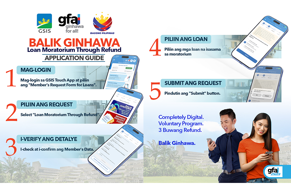 Participation in Balik Ginhawa is voluntary. Members who wish to avail may apply through the GSIS Touch mobile application. The GSIS has clarified that no additional interest or penalties will be charged for the extension.
